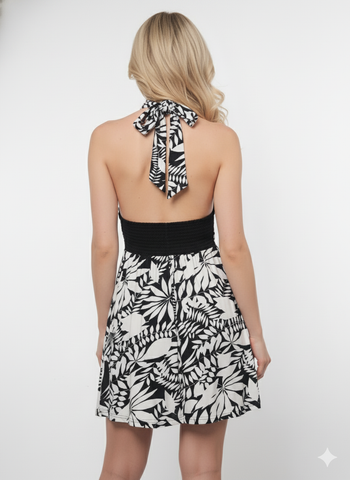 Step into effortless elegance with our Monochrome Tropical Halter Dress, designed for sunny days, resort getaways, and chic casual outings. This dress features a striking black-and-white tropical print that makes a bold style statement while staying timeless and versatile.